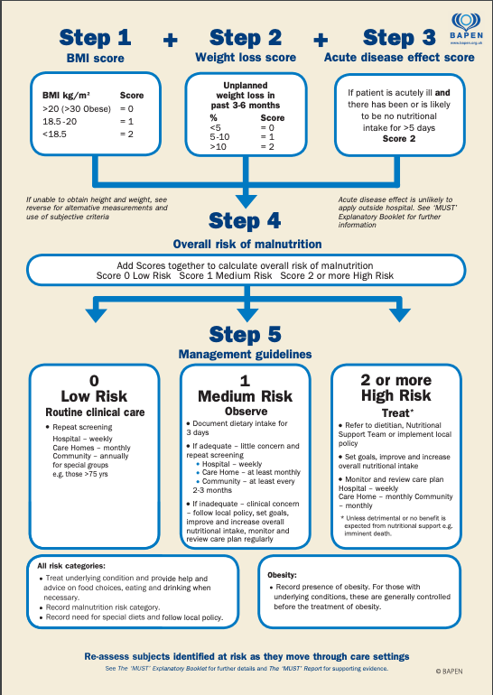 For anyone who needs an NG tube, they will automatically score a MUST of 2 irrespective of their weight and BMI, due to the fact that NG tubes are generally only placed if someone cannot or will not be able to eat enough for more than 5 days.