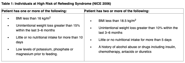 - High risk: 10kcals/ kg/ day, increasing over 3-5 days until normal intake resumed.